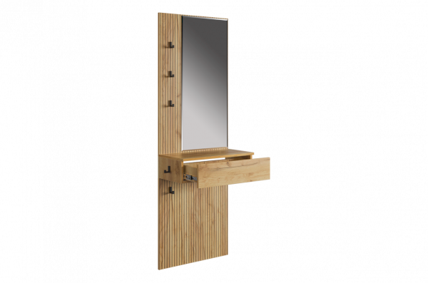 Принт, имитирующий вертикальную фрезеровку, придает зеркалу уникальный и современный вид, добавляя текстуру и глубину. Материал каркаса – ЛДСП, что обеспечивает прочность и долговечность, а также легкость в уходе.